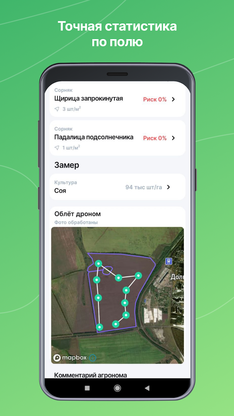 Drone‑powered field scouting and mobile workflows with CV weed recognition, crop density, and timely analytics.